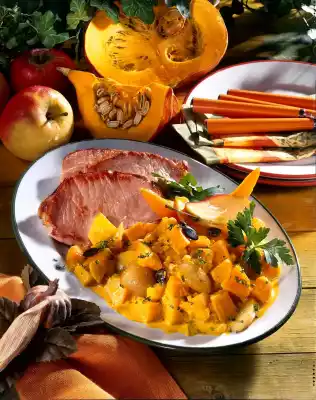 Cut the pumpkin into pieces, remove seeds, cut into slices and peel. Cut the flesh into pieces. Onions peel, dice. Peel, quarter, core and chop apples. Sprinkle with lemon juice