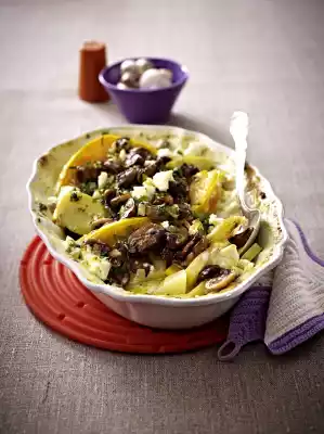Wash the pumpkin, quarter it and scrape out the seeds and fibres with a spoon. Cut the pumpkin with skin into thin slices. Peel and wash the potatoes and cut them into thin slices.