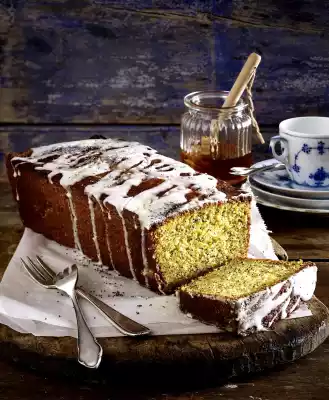Remove, leave to rest in the mould for approx. 10 minutes, turn out of the mould and allow to cool. Mix icing sugar and 2 tablespoons of water. Spread the icing and the remaining honey on the cake. Sprinkle with poppy seeds.