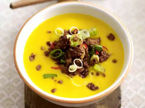 Bring the vegetable stock to the boil. Add pumpkin and carrots and simmer covered for about 20 minutes. Then puree.