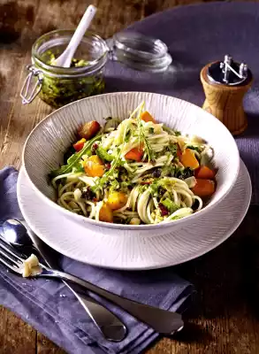 Heat 2 tablespoons of olive oil in a frying pan. Fry the pumpkin for 5-7 minutes, turning it over. Add 1-2 tbsp. agave syrup and allow to caramelise slightly. Season to taste with salt and pepper. Drain noodles, put them in a sieve and add to the pumpkin. Add half of the pesto and mix everything well. Pour into bowls and garnish with the rest of the rocket. Add the rest of the pesto