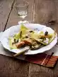 Put the rocket, cranberries, apple chips, garlic, lemon peel and nuts in a large mortar and crush them slightly, dripping 80 ml of olive oil into it (if there is no mortar, simply cut the ingredients for the pesto into small pieces and mix them with the olive oil). Season with salt, pepper, 1 tbsp. agave syrup and lemon juice