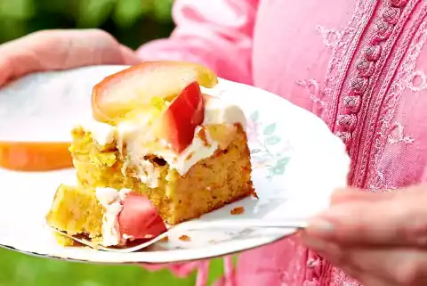 In the meantime, quarter the remaining apples, core them and cut them into thin slices. Bring 4 tablespoons of sugar and 6 tablespoons of water to the boil in a pan, simmer for 2-3 minutes until the sugar has dissolved. Steam apple slices for about 3 minutes. Leave to cool. Mix cream cheese, icing sugar and cream. Spread cream on the cake. Cut cake into pieces and spread apples on top.