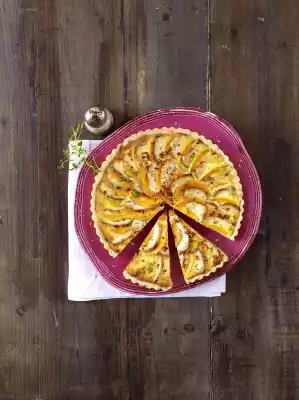 Season egg-milk with salt, pepper and chilli. Cut fillets into thin slices. Roll out the dough on a floured work surface until round (approx. 28 cm Ø). Grease a round tart dish (approx. 24 cm Ø) with lift-off base and line with the dough. Cut off protruding edges. Spread pumpkin and chicken slices fan-shaped in 2 layers on the dough. Pour egg-milk over it and bake in the preheated oven (electric cooker: 200 °C/ convection oven: 175 °C/ gas: level 3) for approx. 45 minutes. Remove the tart from the oven, garnish with thyme