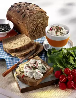 Mix cream cheese and milk until smooth. Season to taste with salt and pepper. Wash the wild garlic, shake dry and cut into strips. Wash and clean the radishes and cut into fine sticks. Fold both into the cream cheese, except for something to sprinkle. Sprinkle with the rest of the radishes and wild garlic. Serve with the bread