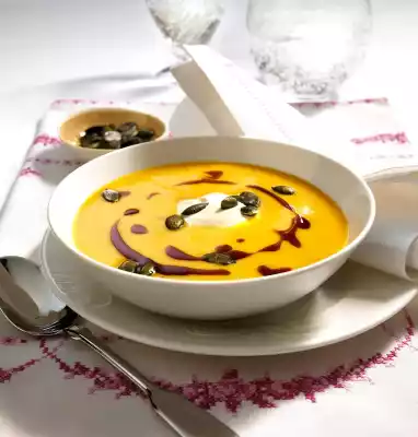 Cover and simmer for 25-30 minutes until the pumpkin flesh is soft. Roast the pumpkin seeds in a pan without fat, remove and put aside. Puree soup finely. Season to taste with salt and pepper. Arrange soup with a dash of crème fraîche and pumpkin seeds, drizzle with oil