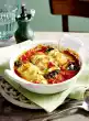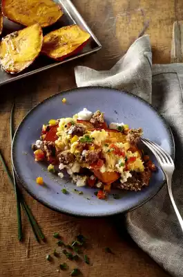 Heat a pan without fat. Pluck the black bread roughly apart and toast it crisply in it. Take the pumpkin out of the oven. Arrange pumpkin, scrambled eggs and cottage cheese on plates. Sprinkle with bread croutons and chives.