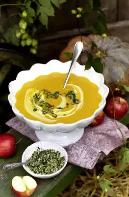 Finely puree the soup, season to taste with salt and pepper. Refine with crème fraîche and pesto