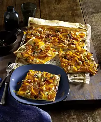 Take 1 tarte flambée dough out of the package, unroll directly on a baking paper. Spread with 125 g sour cream, spread half of the pumpkin and half of the shallots evenly on top. Sprinkle with pepper, some salt, half of the orange peel and half of the thyme