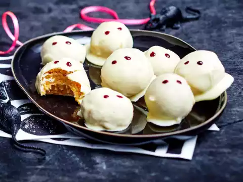 Roughly chop 150 g of chocolate coating and melt in a hot water bath. Form approx. 15 balls from the pumpkin mass. With the help of a wooden stick dip into the couverture and cover completely with couverture. Drain and place on a piece of baking paper.