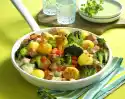 Heat 2 tablespoons of oil in the frying fat. Fry the potatoes and vegetables for approx. 10 minutes, turning them more often. Fry the apple for about 5 minutes. Season with salt and asia sauce
