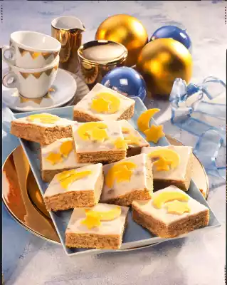 Let cool off. In the meantime knead the remaining raw marzipan paste and 30 g icing sugar and colour yellow with food colouring. Sieve some icing sugar onto a work surface, roll out the marzipan and cut out moons and stars as desired. Mix the remaining icing sugar (400 g), rum, lemon and orange juice to a smooth glaze. Spread the icing on the cake and decorate with moons and stars. Leave to dry and cut into about 25 pieces