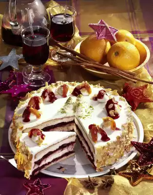 Roast the almonds, let them cool down. Put 1/3 of the remaining cream in a piping bag with a perforated spout. Spread the rest of the cream on the cake, press the almonds to the edge. Warm up the jelly. Cut the rest of the fruit into slices and toss in. Spray the rest of the cream onto the cake as small tuffs and high tuffs as fir trees. Decorate the cake with fruit, pistachios and pearls