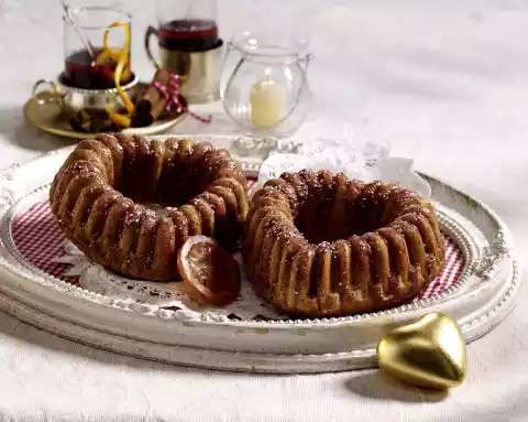 Cream fat with 200 g sugar and vanillin sugar. Mix flour, baking powder, cinnamon and salt. Add eggs, 375 ml red wine and flour mixture. Beat with the whisk of the hand mixer for about 3 minutes. Grease the heart ring form (500 ml content). Fill 1/3 of the dough into the form and smooth it down. Bake in the preheated oven (electric cooker: 175 °C/ convection oven: 150 °C/ gas: level 2) for 20-30 minutes.