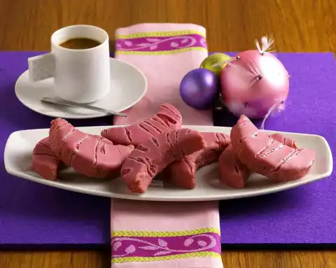 Put red wine (or currant juice), cinnamon stick, star anise, cloves and orange peel in a pot and bring to the boil. Let it simmer for about 10 minutes. Then let it cool down. Pour punch through a sieve. Stir butter, sugar, vanilla bean, citro bean and cinnamon until light creamy. Add the eggs one after the other, stirring each egg for at least 2 minutes. Keep stirring until the sugar is dissolved. Mix flour, pudding powder and baking powder. Stir briefly with 100 ml punch into the dough. Spread the dough on a baking tray covered with baking paper. Bake in the preheated oven (electric cooker: 175 °C on medium rack/ convection oven: 150 °C/ gas: level 2) for about 25 minutes. After baking, prick the cake several times and immediately soak it with 75 ml punch. Let it cool down on a cake rack. Then carefully cut out moons (7 cm long) from the dough. Mix icing sugar with 6-7 tablespoons of punch. Warm up the redcurrant jelly while stirring, fill into a freezer bag. Cut off a small corner. Cover moons with punch and decorate them with the jelly in strips