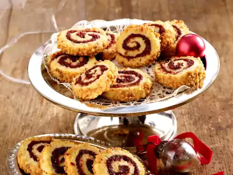 Cut the dough straight. Spread the dough roll all around with egg white and roll in brittle. Cut into approx. 34 slices. Put snails on two baking trays lined with baking paper. Bake one after the other in a preheated oven (electric cooker: 200 °C/ convection oven: 175 °C/ gas: level 3) for 16-18 minutes. Let the biscuits cool down on a cake rack