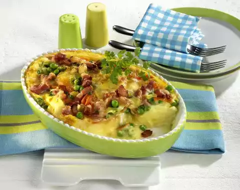 Mix the eggs and 2 tablespoons of milk and season well. Season vegetables to taste. Stir the puree 1x and spread it in the casserole dish. Spread vegetables, bacon and cheese on top