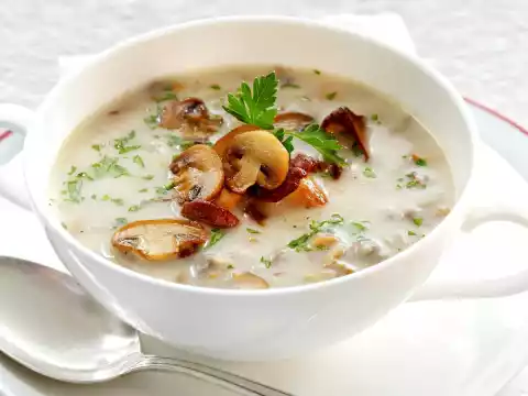 Heat 1 teaspoon of oil in a coated frying pan. Sauté the mushrooms for about 3 minutes. Add 150 g cream and 3/4 of the chopped thyme to the soup, bring to the boil and puree. Season soup with salt and pepper and arrange in soup bowls.