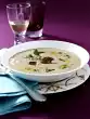 Pour the remaining cream in streaks onto the soup, then spread fried mushrooms in the middle. Sprinkle the soup with thyme and garnish.