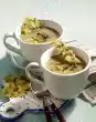 Peel and finely dice the onion and garlic. Melt the fat in a pot. Sauté onion and garlic in it. Add peas and flour. Deglaze with broth while stirring and bring to the boil.
