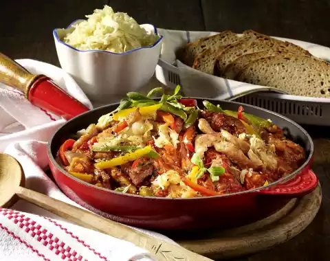 Brown the meat and onions in it. After 3-5 minutes add tomato paste and paprika and fry. Dust with flour. Deglaze with tomatoes and stock while stirring. Drain and add sauerkraut. Stir in Aiwar.