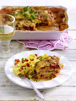 Cook the pasta in boiling salted water according to the instructions on the packet. Wash parsley, shake dry, put one leaf aside for garnishing and finely chop the rest of the parsley. Pour the noodles into a sieve, quench briefly, drain. Sprinkle casserole with parsley and garnish. Arrange one piece of casserole and noodles with casserole liquid on plates