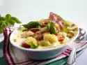 Peel and finely dice the onions. Clean, wash and finely dice the peppers. Mix onions and paprika and season with salt, pepper and paprika. Mix cream and aiwar