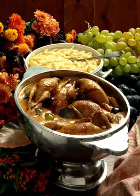 Carefully remove quail from the pot and keep warm in a bowl. Pour sauce through a sieve and bring to the boil. Stir cream and flour until smooth. Add to the sauce while stirring and bring to the boil briefly.