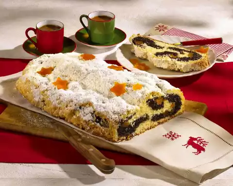 Knead first with the dough hooks of the hand mixer, then with your hands to a smooth dough. Roll out the dough on a floured work surface to a rectangle (approx. 30 x 40 cm). Spread and spread poppy seed mixture over it. Sprinkle with apricots. On both shorter sides of the rectangle, fold the dough over the filling by about 2 cm. From one long side roll up about 1/3. From the other side, roll up and place the larger roll slightly over the smaller roll to make a stollen shape. Place the stollen on a baking tray lined with baking paper. Bake in a preheated oven (electric cooker: 200 °C/ convection oven: 175 °C/ gas: level 3) for approx. 10 minutes. Reduce oven heat (electric oven: 175 °C/ convection oven: 150 °C/ gas: level 2) for approx. 45 minutes. Melt 50 g butter and spread on warm stollen. Dust thickly with icing sugar and let cool off.