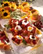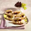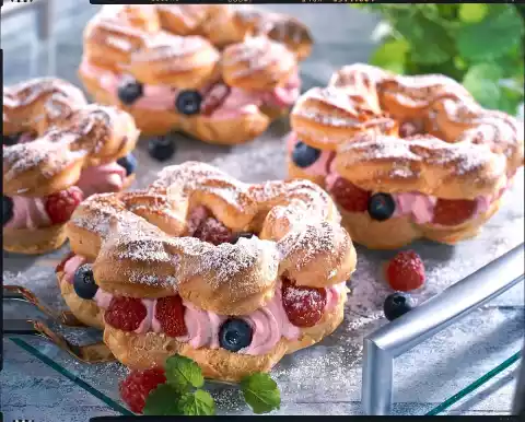Knead the eggs with the dough hooks of the hand mixer one after the other (!) well under the brandy. Pour into a piping bag with a large star-shaped spout. Spray 6 flowers (approx. 8 cm Ø) at a sufficient distance on 2 baking trays lined with baking paper. Bake one after the other in a preheated oven for about 20 minutes. Let rest for 2-3 minutes, then cut in half horizontally. Let the flowers cool down