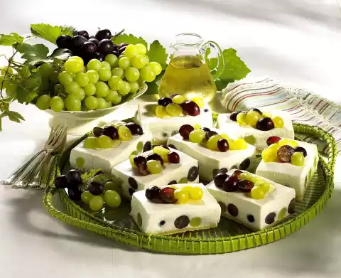 Cut the cake into 20 pieces. Decorate with remaining grapes. Stir the cake glaze powder, 2 tablespoons of sugar, apple juice and 125 ml cold water until smooth. Boil up while stirring. Let cool for 1 minute and drizzle over the grapes with a tablespoon. Allow to set