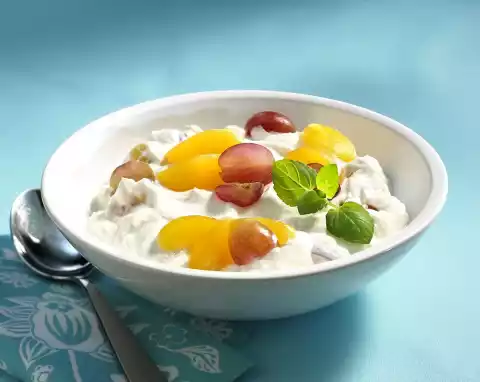 Cut the apricot halves into slices. Wash and halve the grapes. Stir curd and milk until smooth, season with sweetener and lemon juice. Stir the fruit, except for something to decorate, into the quark and arrange in a bowl. Decorate with lemon balm and other fruit