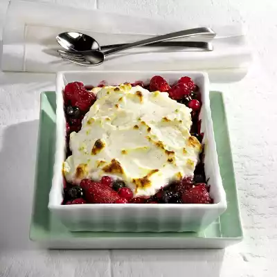 Add icing sugar and beat for another 2 minutes. Fold the egg whites into the quark mixture. Pour the fruit into an ovenproof dish. Add the quark and egg mixture. Gratinate in the preheated oven (electric cooker: 225 °C/ convection oven: 200 °C/ gas: level 4) for approx. 10 minutes