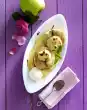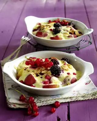 Roast the flaked almonds in a small pan without fat until golden brown, remove. Wash the berries and fruit. Sort the berries. Strip the currants, except for a few panicles for decoration, from the panicles with a fork. Cut peaches in half, stone them and cut the flesh into wedges. Mix the fruit and distribute in 4 ovenproof moulds.
