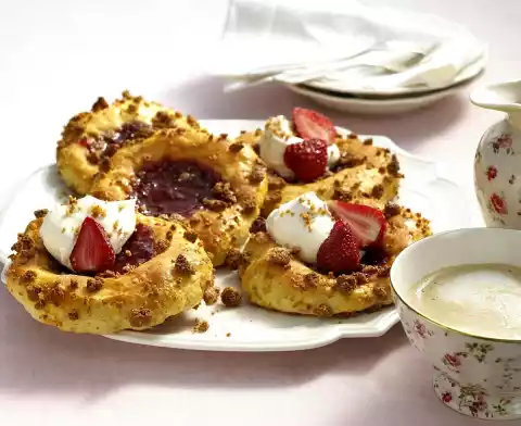 Knead in the remaining flour. Form the dough into a thick roll on a floured work surface and cut into 8 equal pieces. Press each piece slightly flat with your hands and make a hollow in the middle. Put thalers on a baking tray lined with baking paper (approx. 32 x 37 cm) and fill each with some strawberry jam. Mix egg yolk and milk. Brush the edges of the thalers with the mixture. Sprinkle with amarettine crumbs and press down lightly. Bake in the preheated oven (electric cooker: 200 °C/ convection oven: 175 °C/ gas: level 3) for 15-20 minutes. Let the thalers cool down on a cake rack. Wash the strawberries, drain well and clean.