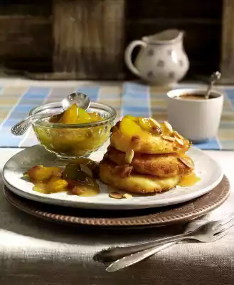 Roast almonds in a pan without fat, remove. Mix quark, egg, 50 g sugar and vanillin sugar. Press cooled potatoes through a potato ricer and stir into the quark cream with the whisk of the hand mixer. Form 12 round thalers from the mixture with moistened hands and turn them on a plate in the breadcrumbs. Heat the fat in a frying pan and fry the legs in portions over medium heat for 5-7 minutes, turning carefully. Arrange on plates with mirabelle plum compote. Sprinkle with almonds