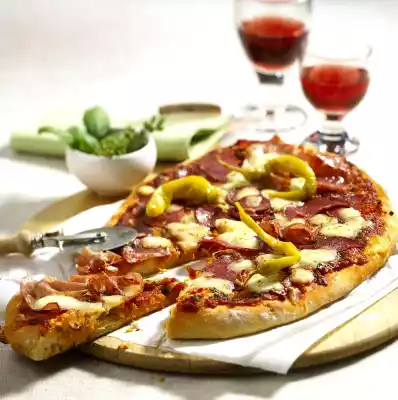 Pour the flour into a bowl and make a depression. Dissolve the yeast in 5 tablespoons of lukewarm water and pour into the depression. Mix with some flour to a pre-dough. Cover and leave to rise in a warm place for about 30 minutes. Warm 200-250 ml of water lukewarm. Add 1 pinch of salt, 2 tablespoons of oil and lukewarm water to the pre-dough and knead until smooth. Form into a ball and cover and let it rise for about 30 minutes. Peel onion and cut into rings. Wash, clean, halve, seed and cut the tomatoes into cubes of about 1 cm. Wash the herbs, shake dry, pluck the leaves from the stalks and cut into small pieces. Heat 1 tablespoon of oil in a pan. Sauté onion until translucent, add tomatoes and steam for another 2 minutes. Season to taste with salt, pepper and herbs. Cut the mozzarella into slices. Roll out the dough oval (25 x 32 cm) on a floured work surface and place on a baking tray lined with baking paper. Spread with the tomato sauce. Cover with sausage and mozzarella slices. Bake the pizza in a preheated oven (electric cooker: 200 °C/ convection oven: 175 °C/ gas: level 3) for approx. 20 minutes. Garnish finished pizza with pepperoni