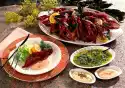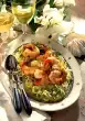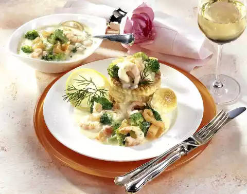 Season to taste with salt, pepper and lemon juice. Cut salmon into strips. Rinse and drain the crabs. Add broccoli, salmon and prawns to the sauce and warm up again. Pour into the pies. Arrange on plates, garnish with lemon slice and dill