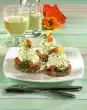 Heat mushrooms, peas, meat and dumplings in the sauce. Fill pies with ragout. Garnish with oregano, tomato rose and lemon