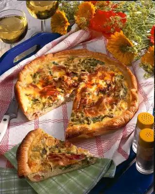 Leave the edge overlapping. Prick the bottom several times with a fork. Spread onion-ham mixture and bacon on top. Pour egg milk over it. Grate cheese over it. Bake in the preheated oven (electric oven: 200 °C/ gas: level 3) on the lower shelf for about 50 minutes.