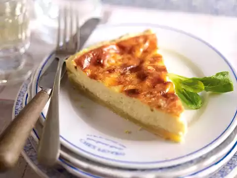 Sprinkle the dough base with breadcrumbs. Pour cheese mixture on top. Bake the quiche on the lowest shelf in a hot oven for 45-50 minutes. Serve hot or cold.