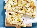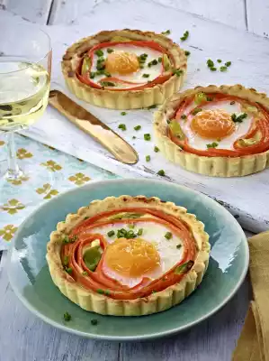 Mix 2 eggs and cream, season with salt, pepper and nutmeg. Grease 8 tartlet cups with lift-off base (approx. 12 cm Ø). Form the dough into a roll and cut it into 8 equal pieces. Roll out the dough pieces one after the other on a floured work surface, round and thin. Line a mould with the dough, press down the edge and cut off any excess dough