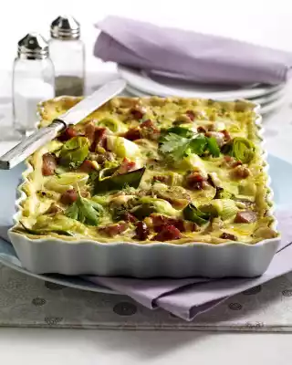 Meanwhile wash the meat, dab dry and cut into cubes. Remove the leek. Add 1 tablespoon of oil to the frying set and heat up again. Add meat to the pan and fry for 5-6 minutes until brown. Mix 4 eggs, sour cream, mustard and milk. Season to taste with salt, pepper and nutmeg. Grease an ovenproof dish (20 x 30 cm) and dust with flour. Roll out the dough, line the baking tin with it, pressing the rim. Prick the base several times with a fork and sprinkle with breadcrumbs. Add the cured pork loin and leek and top up the quiche with the egg milk. Grate the cheese and sprinkle over it. Bake in the preheated oven (electric cooker: 175 °C/ convection oven: 150 °C/ gas: level 2) on the lower rack for 40-50 minutes until golden brown.