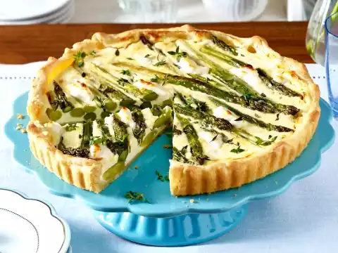 Cut the goat cheese into slices. Put asparagus in the form. Spread goat's cheese in between. Pour a sand glaze over it. Bake the quiche in the middle of the preheated oven (electric cooker: 200 °C/ convection oven: 175 °C/ gas: see manufacturer) for 35-40 minutes. Remove from oven, remove from the mould and garnish with remaining thyme.