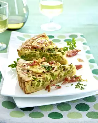 Grease a tart mould (26 cm Ø) and lay it out, pressing down the edge. Cut off the protruding edge. Put peas and bacon, except for something to sprinkle, into the tin and pour egg cream over it. Halve the processed cheese corners horizontally and spread on the quiche. Bake the quiche in a preheated oven (electric cooker: 200 °C/ convection oven: 175 °C/ gas: see manufacturer) for 30-35 minutes. Sprinkle with parsley and remaining bacon and garnish with parsley leaves