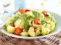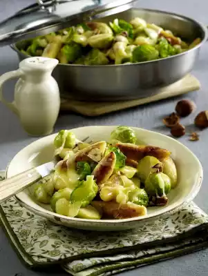 In the meantime heat oil in a pan. Fry the potato noodles for about 5 minutes. Add onion and Brussels sprouts and fry for about 2 minutes. Season to taste with salt, pepper and nutmeg.