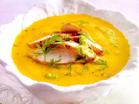 Puree the soup and season to taste. Chop the carrot green. Cut meat into slices. Serve with carrot green and pesto on the soup. Bread tastes good with it.