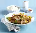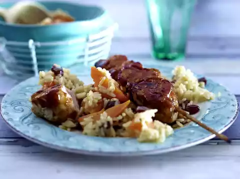 Heat the oil in a large frying pan and fry the fillet skewers for 1-2 minutes, turning them over. Brush with the marinade and fry over medium heat for about 3 minutes. Arrange chicken skewers on the carrot-raisin rice