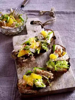 Add sherry, ketchup, mayonnaise and 1/4 teaspoon cayenne pepper to the juice of the clementines and mix. Season salad dressing with salt and pepper. Fold in the meat, cabbage, mangetouts and fruit fillets.