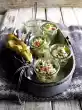 Press the juice from the parting skins into a bowl. Clean and wash the cabbage and mangetouts and cut into fine strips. Cook both in boiling salted water for about 2 minutes, drain, rinse and drain.